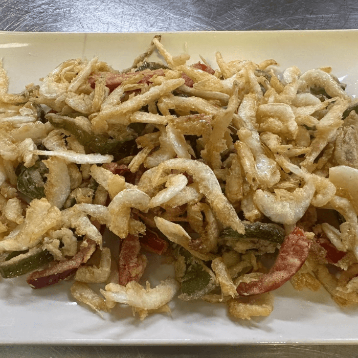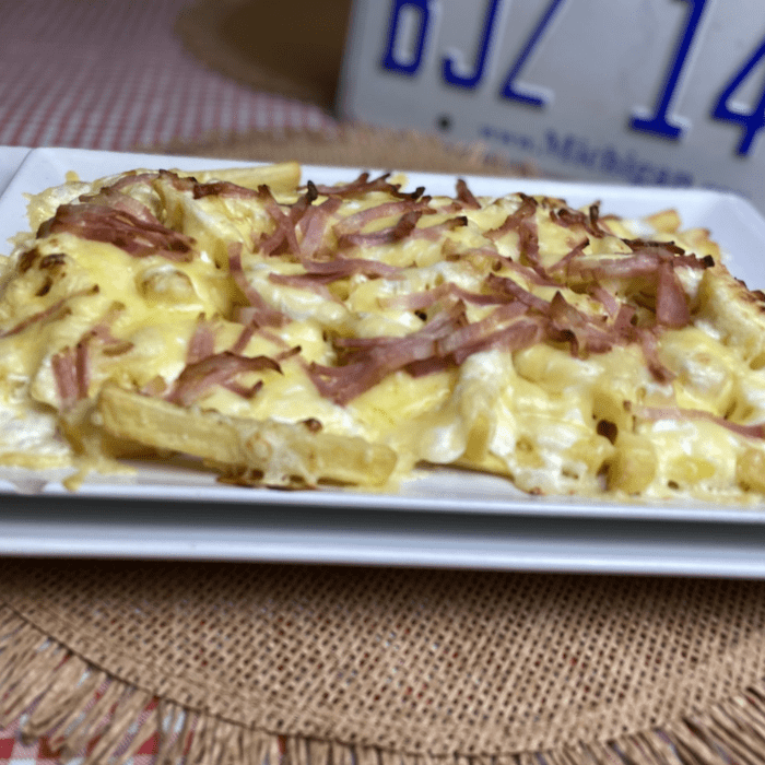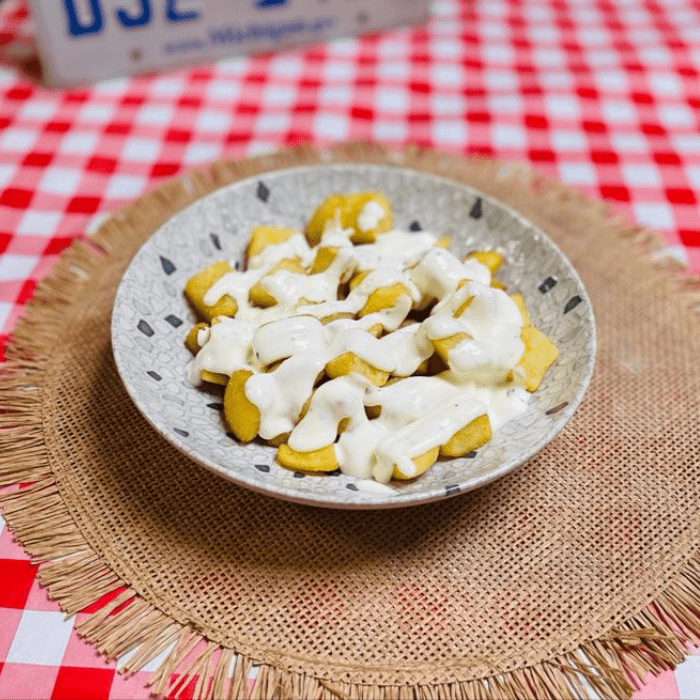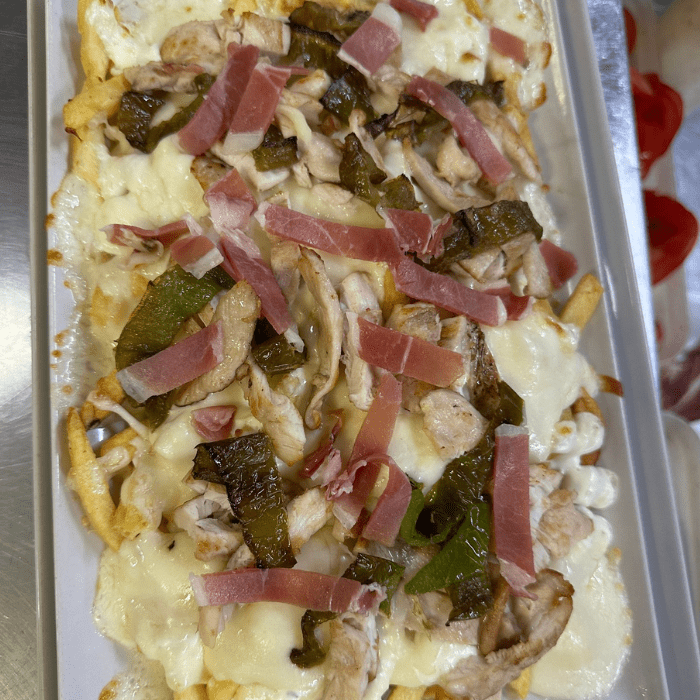 Patatas, pollo, alioli, queso, pimiento y jamón