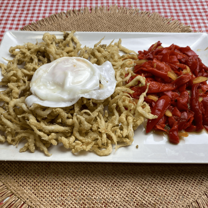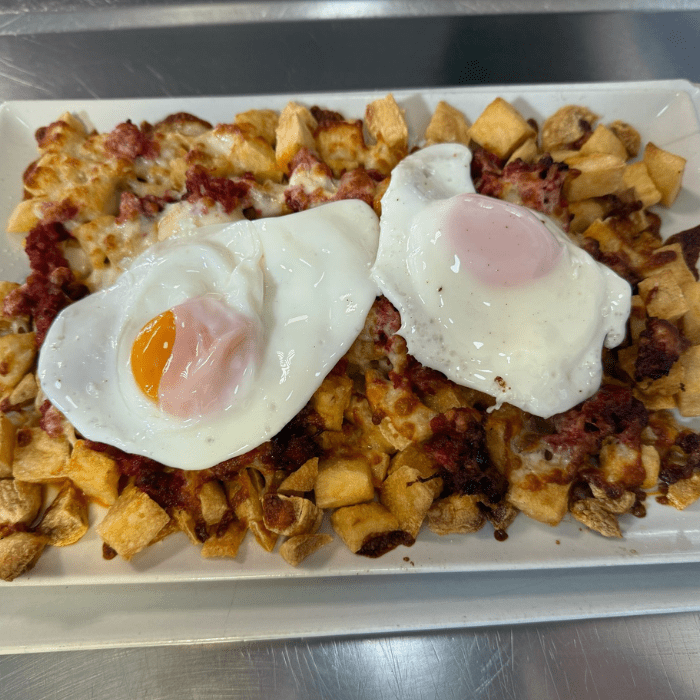 Patatas, Chorizo de pueblo, Mozzarela, Huevos fritos