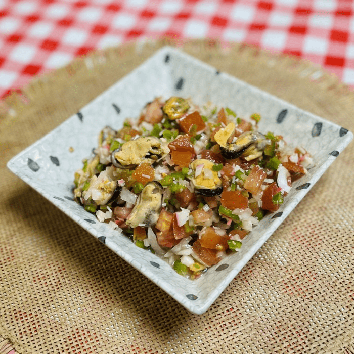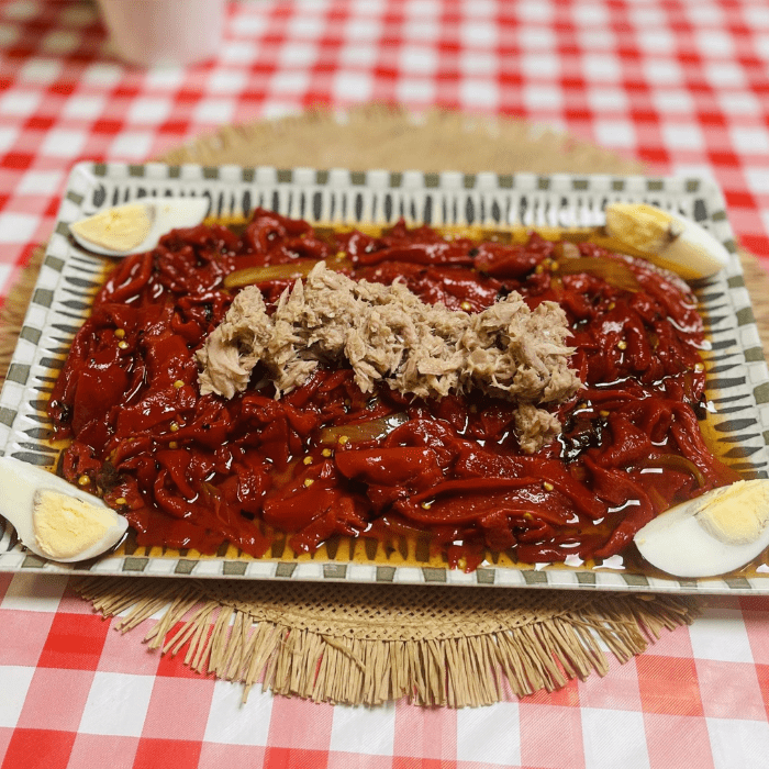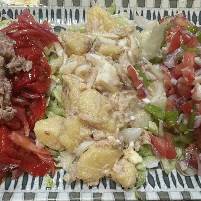 Surtido de ensalada de pimientos, salpicón de marisco y papa aliñada