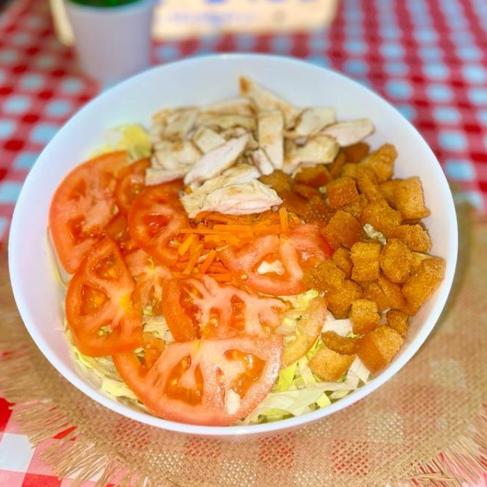 Lechuga, tomate, zanahoria, pechuga de pollo, picatoste y salsa César