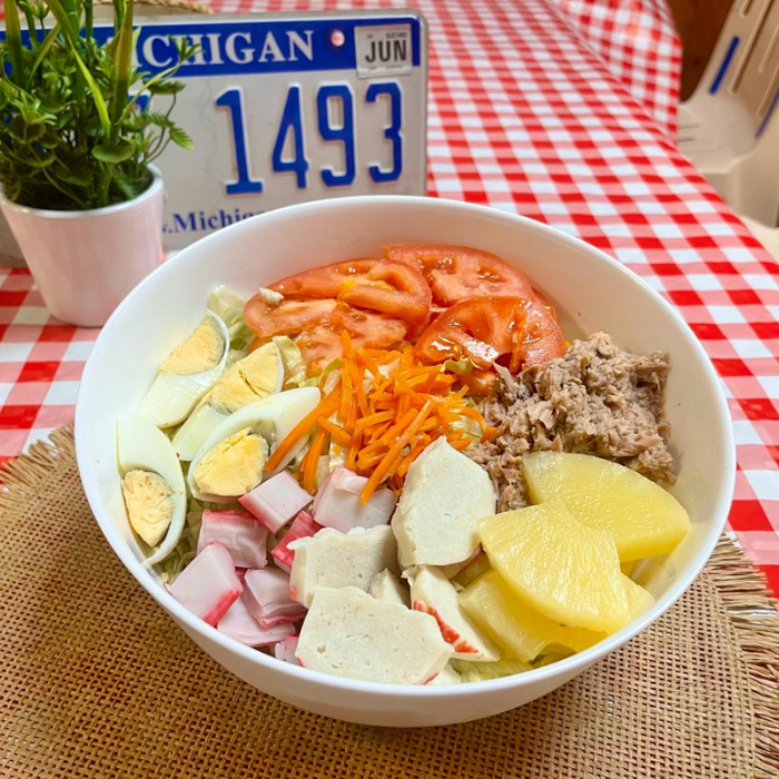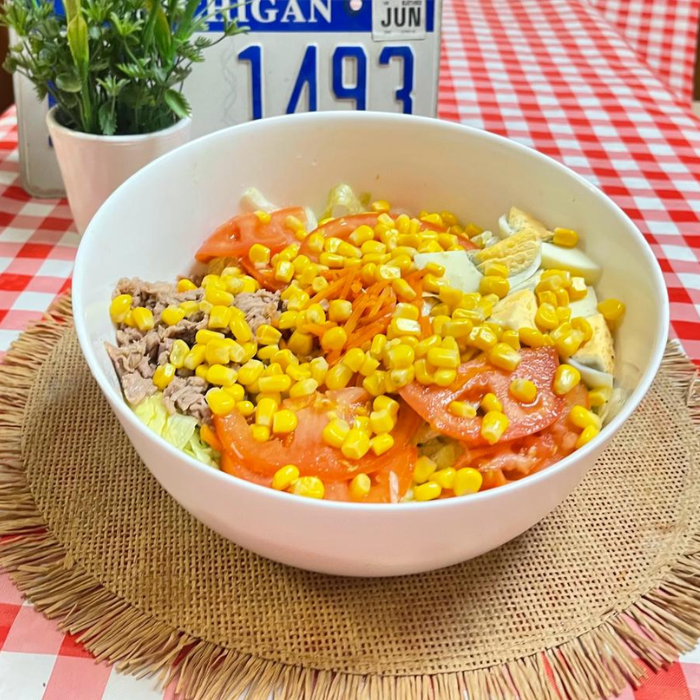 Lechuga, tomate, zanahoria, maíz, atún y huevo