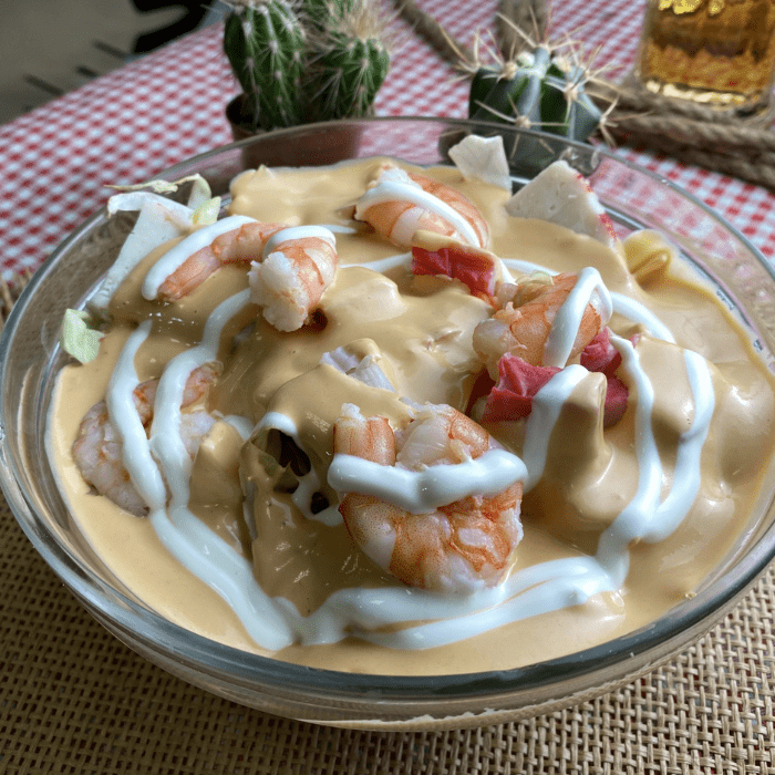 Lechuga, cola de langosta, delicias de mar, langostinos y salsa rosa