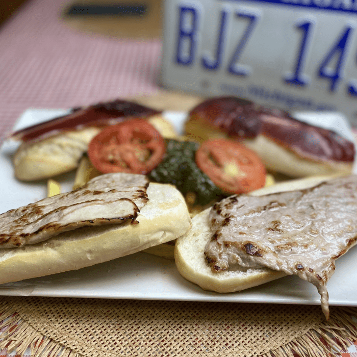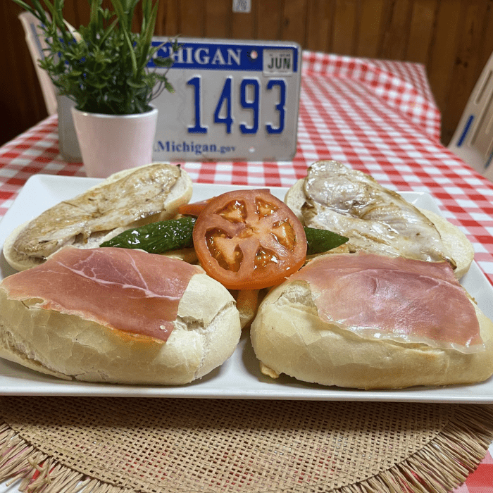 Dos piezas de pan, pechuga de pollo, jamón serrano,