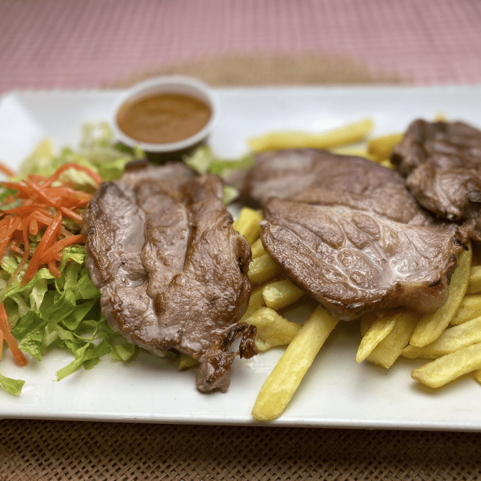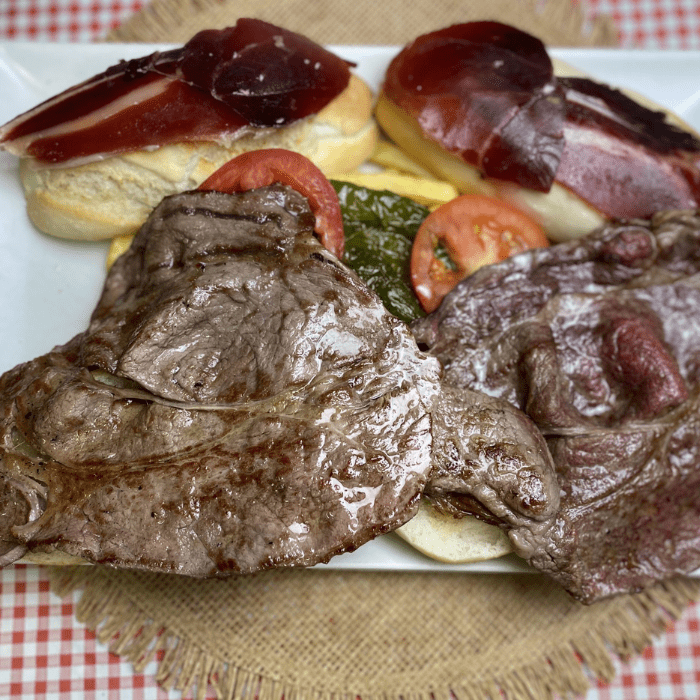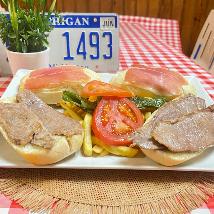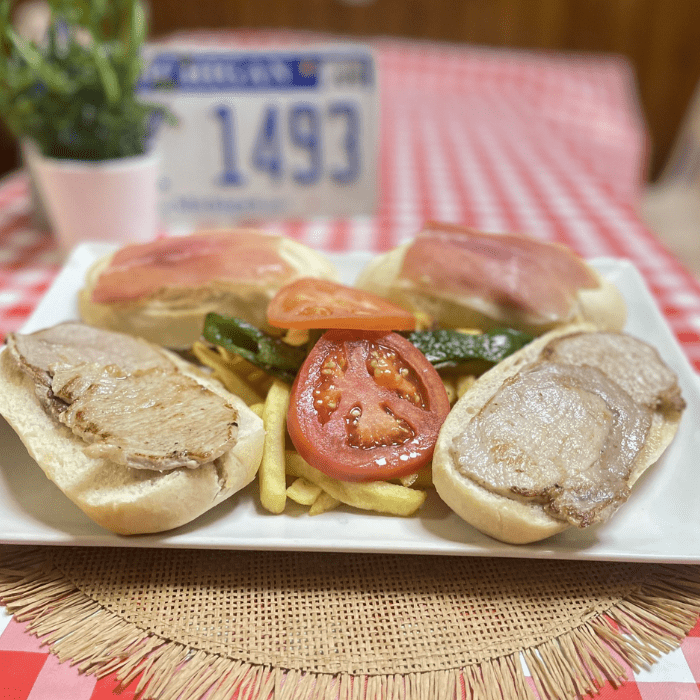 2 piezas de pan, solomillo, jamón serrano, salsa whisky, pimiento, tomate y patatas fritas.