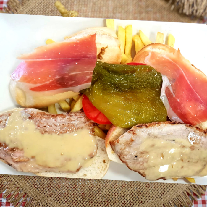 2 piezas de pan, pechuga de pollo empanado, jamón serrano, pimiento, tomate, patatas fritas y salsa alioli.