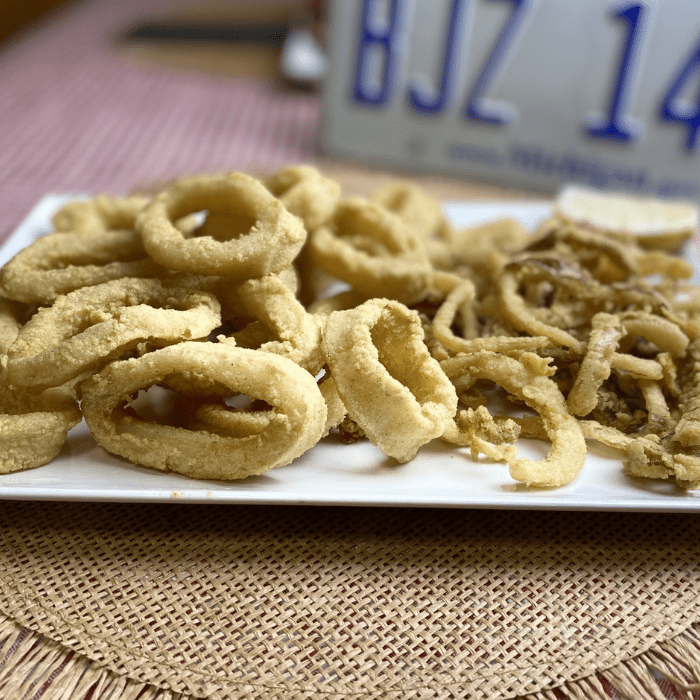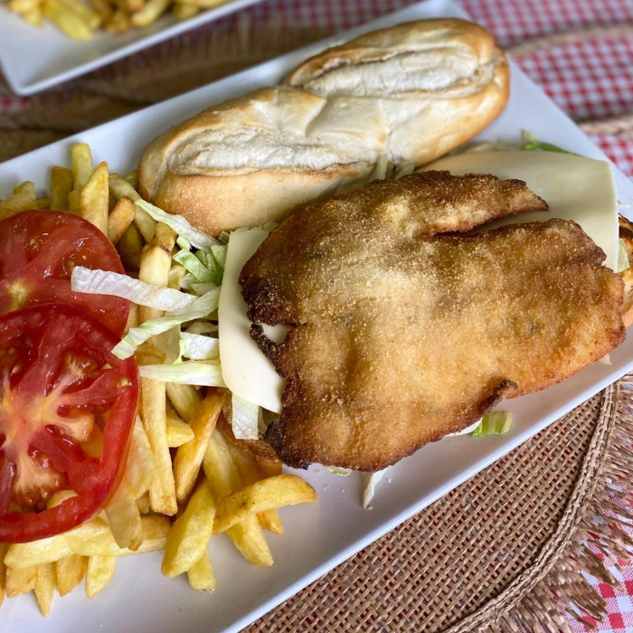 Viene andaluza, pescado de rosada empanada, queso, lechuga, tomate y mayonesa.