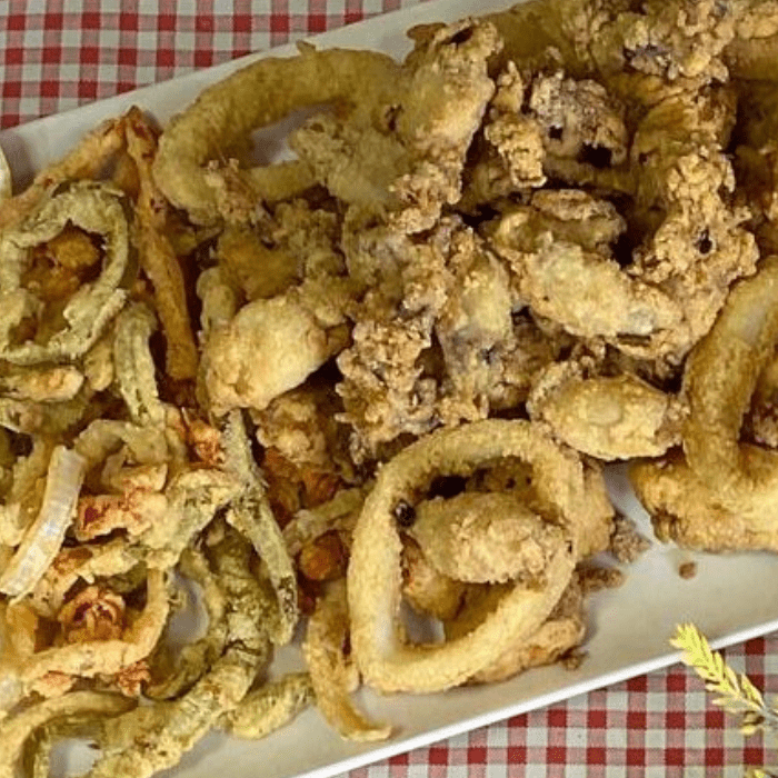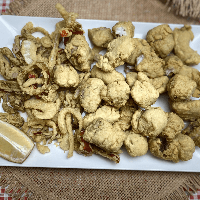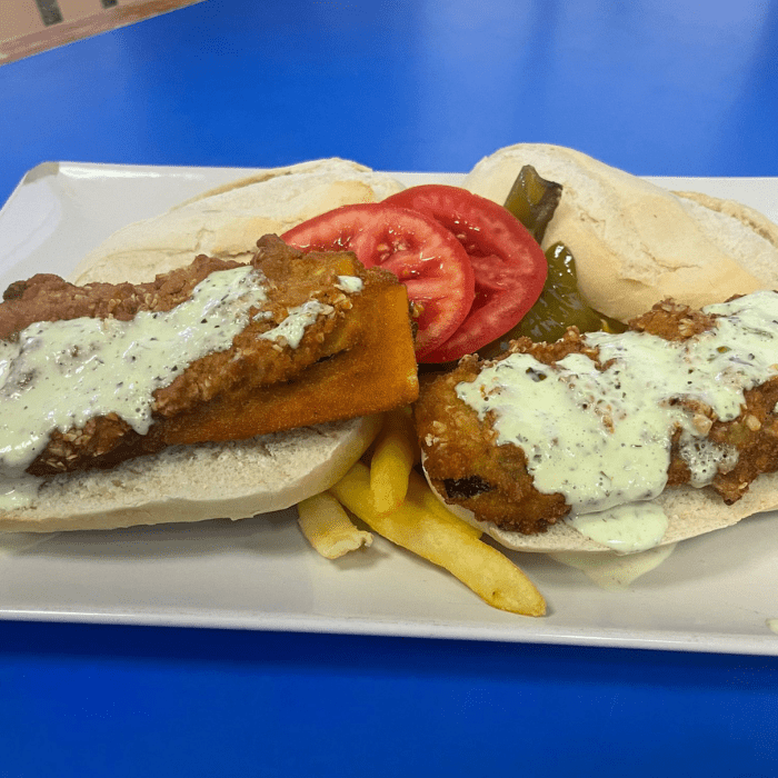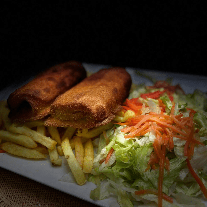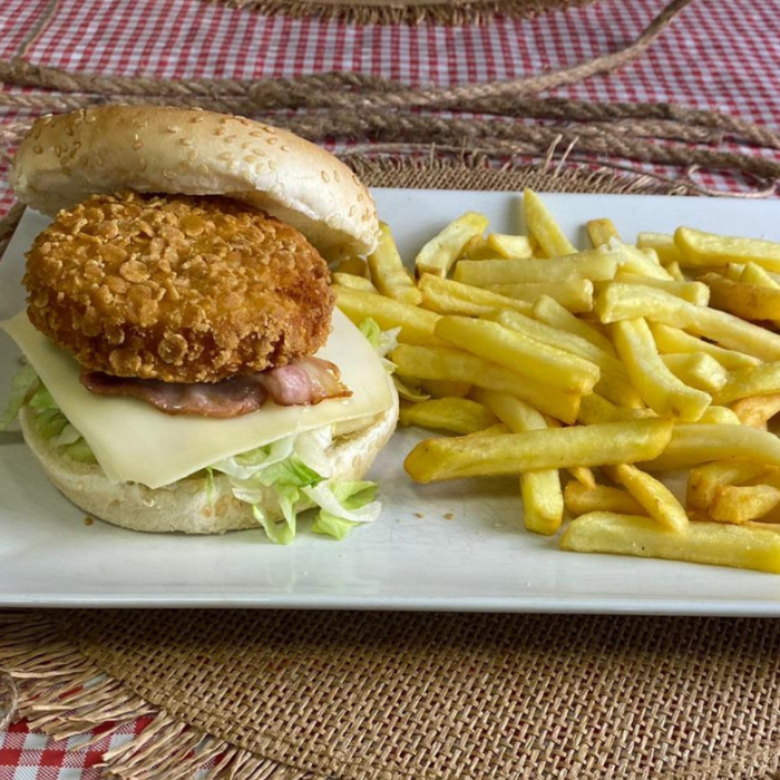 2 piezas de pan, calabacín empanado crujiente relleno de queso vegano, tomate, pimiento, alioli vegano y patatas fritas.