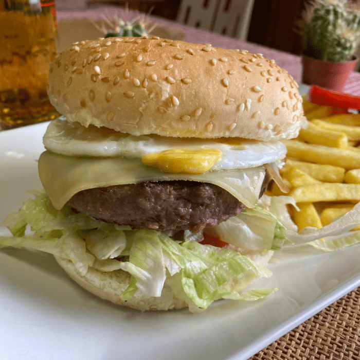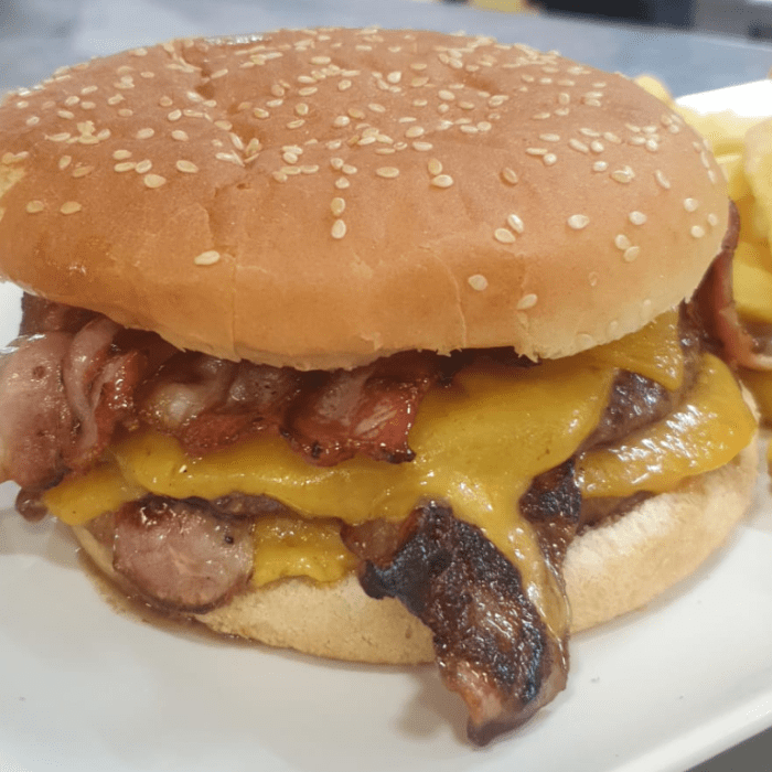 Carne de Buey, bacon, huevo, queso, tomate, lechuga y patatas fritas. Tamaño XXXL Doble carne de Buey (500gr), queso y bacon.