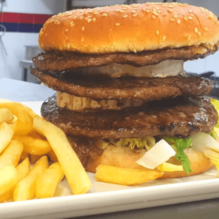 Doble carne de hamburguesa de ternera, lechuga, tomate, cebolla caramelizada y rulo de queso de cabra. Tamaño XXXL: Triple Hamburguesa, queso y