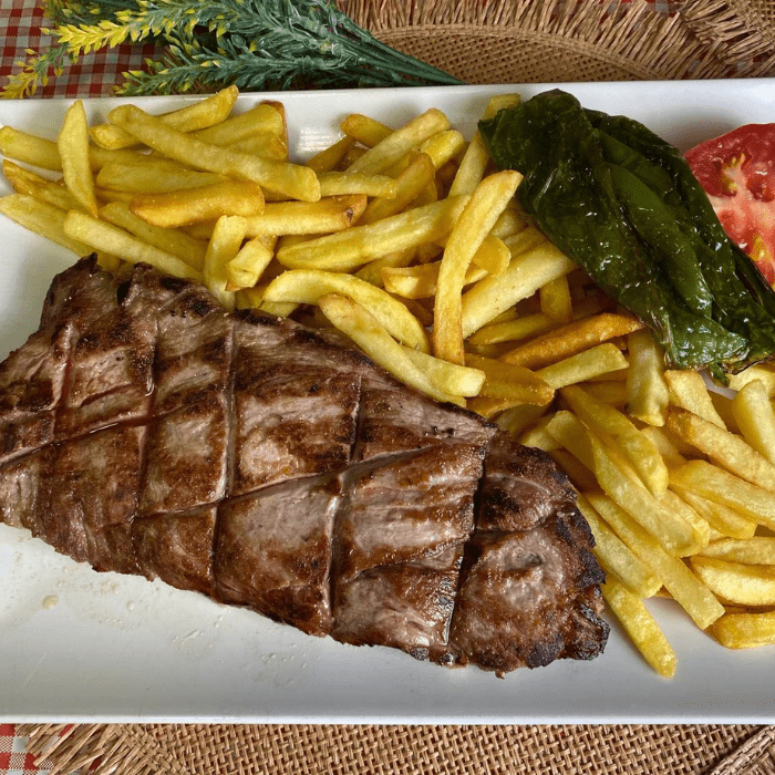 2 piezas de pan, solomillo, jamón serrano, pimiento, tomate y patatas fritas.