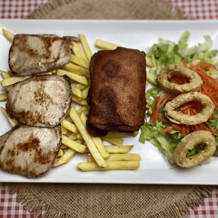 Merluza a la Roteña, lomo a la plancha, dos huevos fritos y patatas fritas.